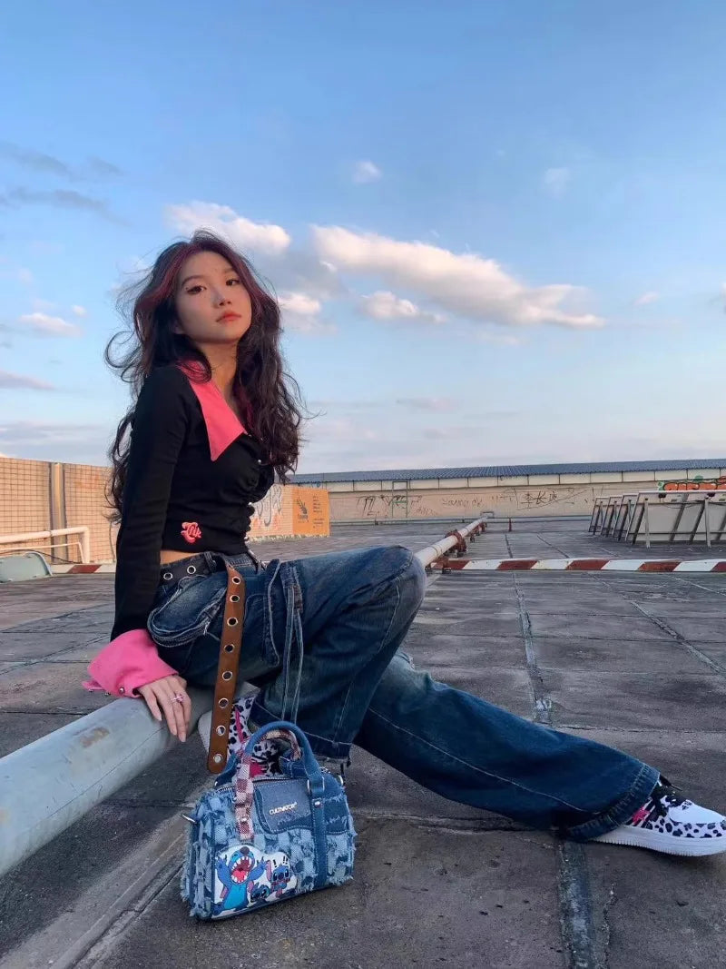Disney Cartoon Stitch Denim Shoulder Bag – Hole-Spliced Crossbody & Portable Pillow Bag, Cute and Casual Design